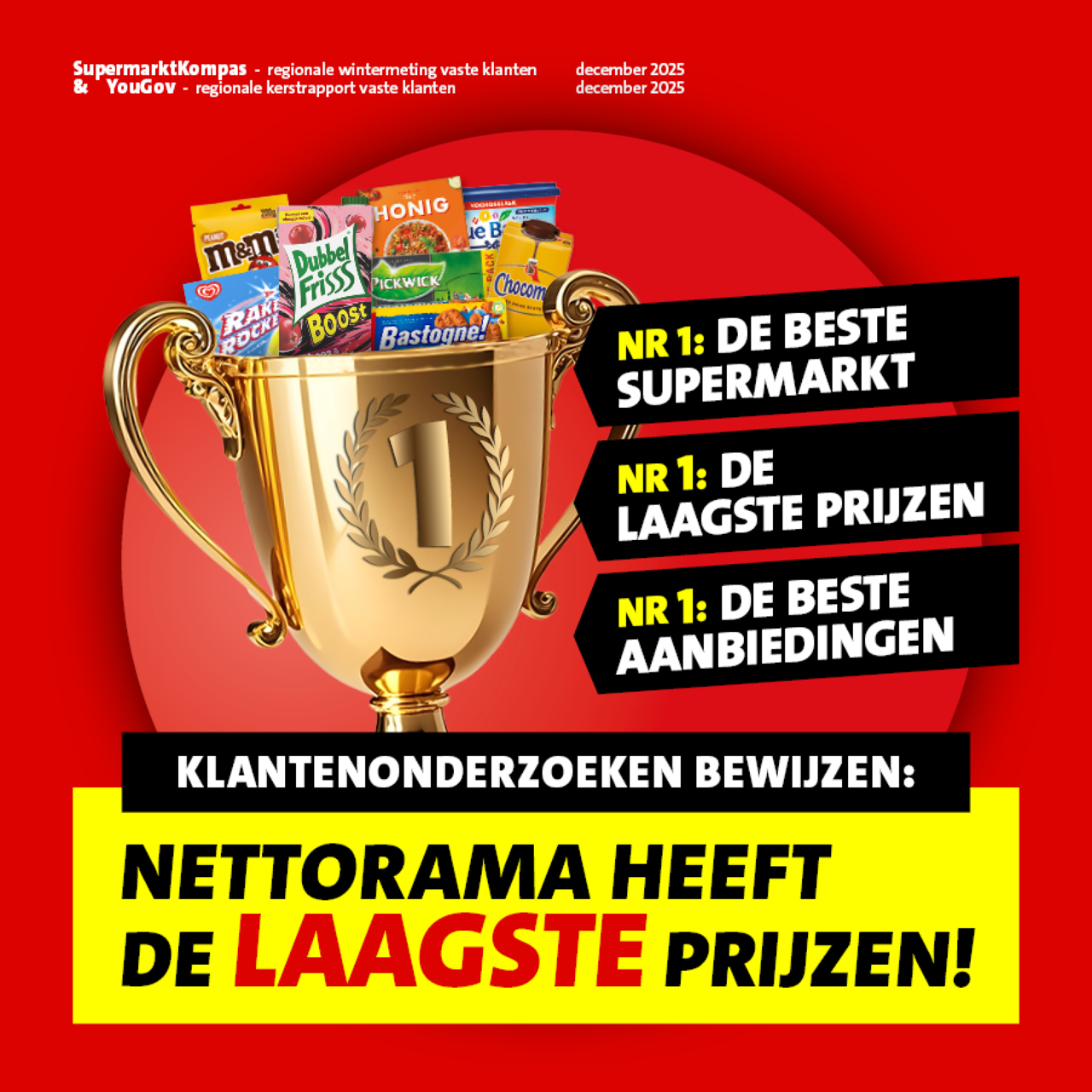Dat blijkt onder andere uit het kerstrapport 2025 regionale formules van onderzoeksbureau YouGov. In dit onderzoek beoordelen consumenten supermarkten op prestaties, productaanbod, winkeluitstraling en service. Uit het rapport blijkt dat Nettorama het hoogste landelijke en regionale eindcijfer scoort op lage prijzen en aanbiedingen. Daarnaast scoren we ook goed op versafdeling, voorraad, breedte assortiment en kwaliteit.